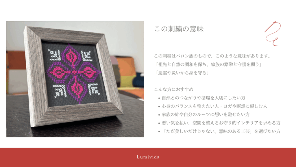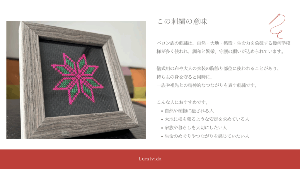 **パロン族(Palaung族)**の伝統刺繍は、彼らの文化、信仰、社会的地位を反映する重要な要素です。刺繍の技法や模様には、魔除け、豊穣、家族の結束、自然との調和などの深い意味が込められています。